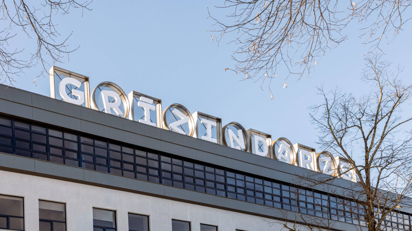 | Uz K1A ēkas jumta izvietotais uzraksts stiprina “Grīziņdārza” klātbūtni pilsētvidē 2026-02-20 · grizindarzs.lv |